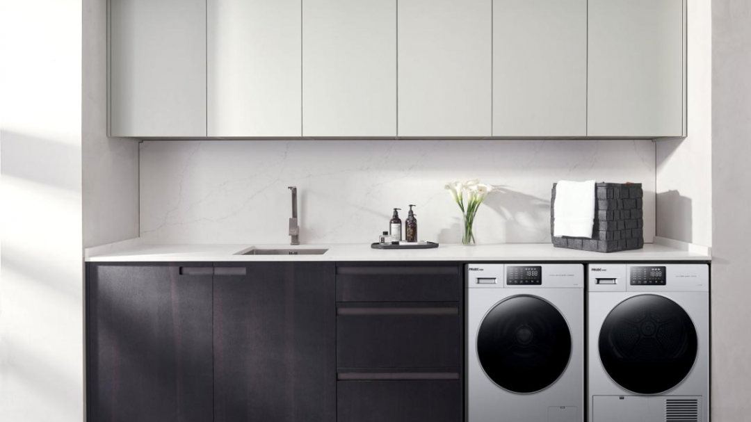 优美的柜体线条,白灰色调,美得自然且舒适,吊柜+开放台+地柜堪称收纳王者组合。将常用的物品置于开放台面,位置清晰可见,取用十分方便。吊柜和地柜各司其职,吊柜可以收纳一些不常用的物品;地柜则可以结合洗衣机与烘干机使用,让每一寸空间都得到合理的利用。
