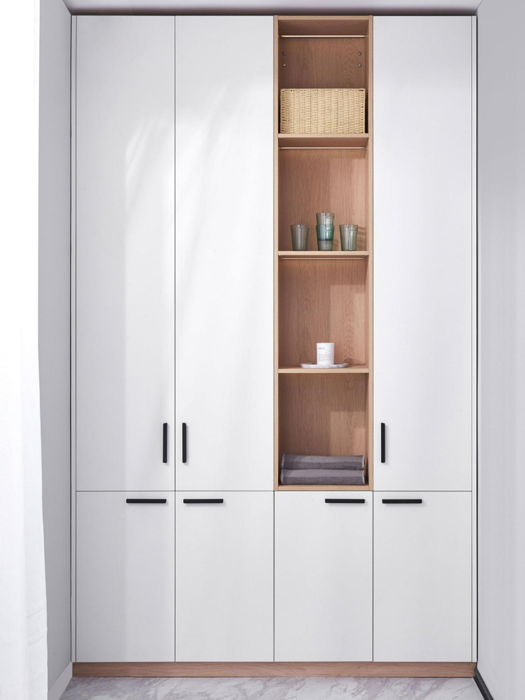 把阳台储物柜做到顶,可以有效缓解室内的空间使用率,保证上下无卫生死角,整体性也更强。柜体内部进行合理分区,根据储存物品的类型规划不同的隔板高度与格子大小,再根据使用习惯分门别类,保证拿取更方便,大大提高收纳能力。开放区增加了收纳和装饰功能,达到美观的效果,使整体空间整齐大方。
