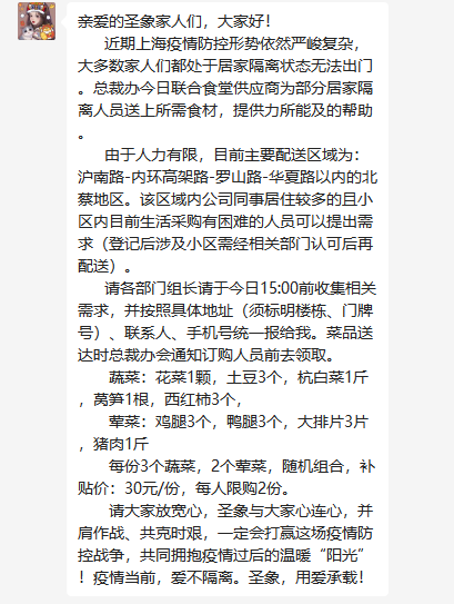 圣象,作为团结如一的大家庭,在全城疫情防控的关键时刻,始终心系身处“风险区”的同事家人,由集团总裁办组织,集结一切可调动的力量,为伙伴们送温暖,送关爱。