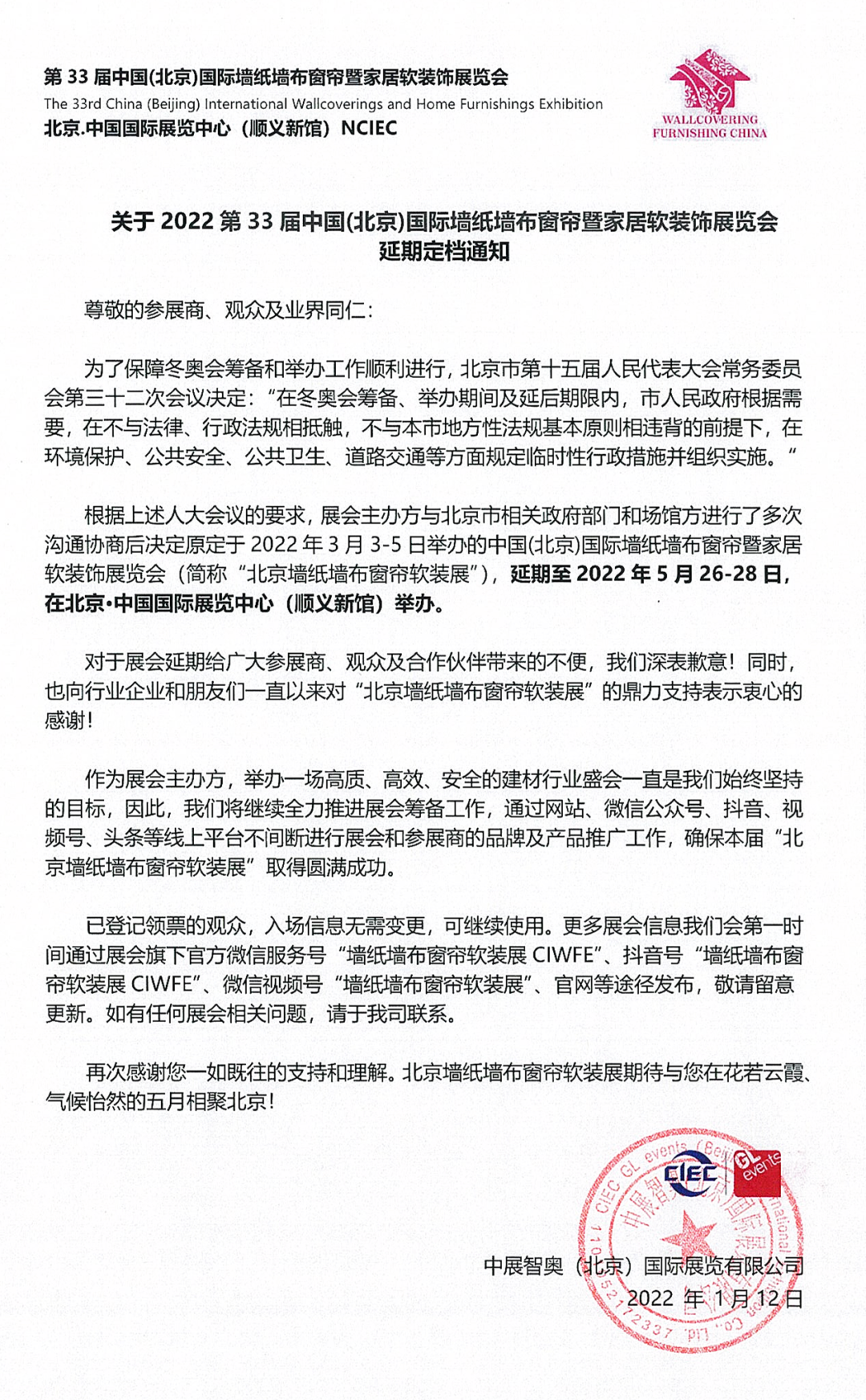 1月12日消息,为保障**会筹备和举办工作顺利进行,原定于2022年3月16-18日举办的第20届中国国际门业展览会暨第8届中国国际集成定制家居展览会,将延期至2022年5月26-28日,在北京·中国国际展览中心(顺义新馆)举办。